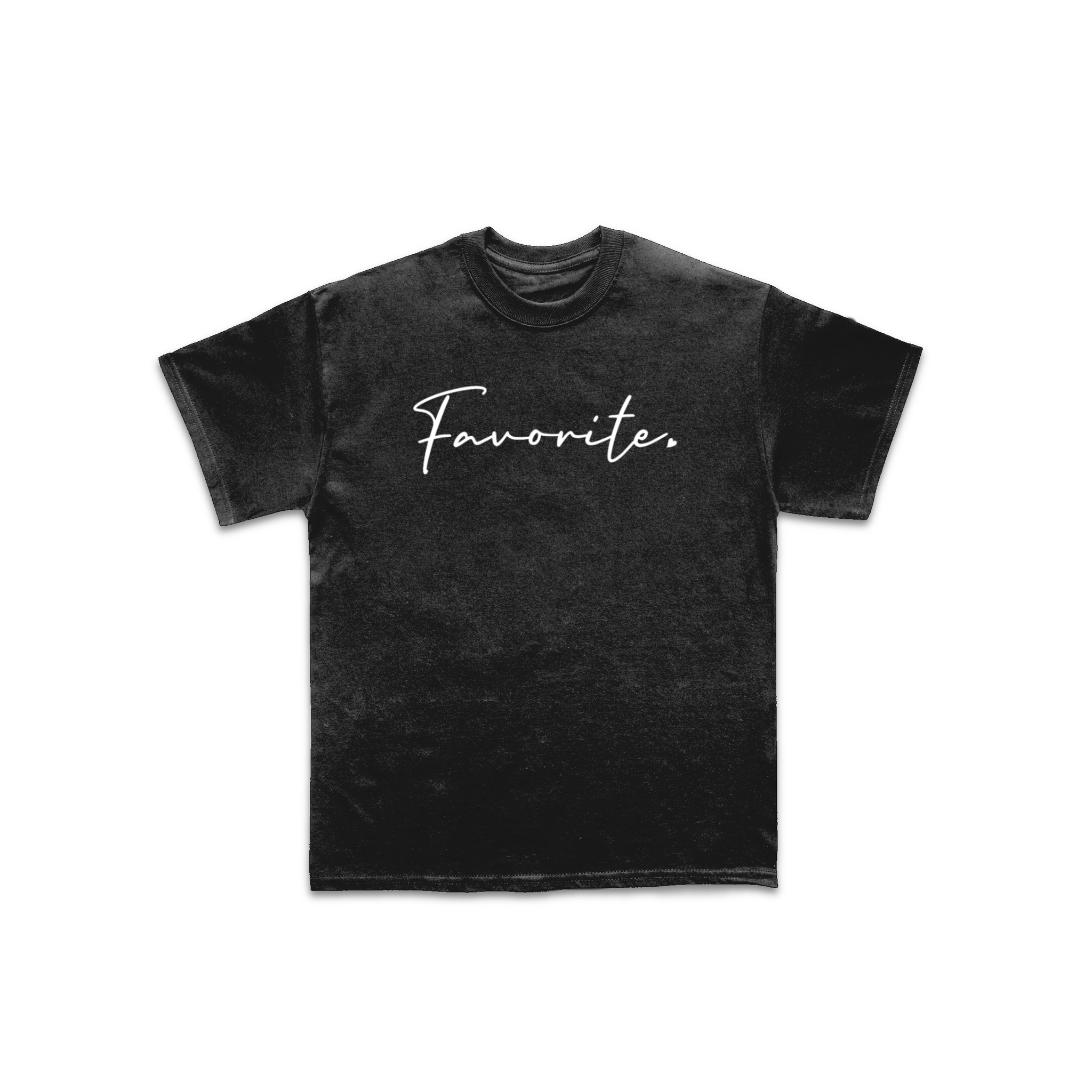 A short-sleeved tee, with the word "favorite" in cursive on the front side.