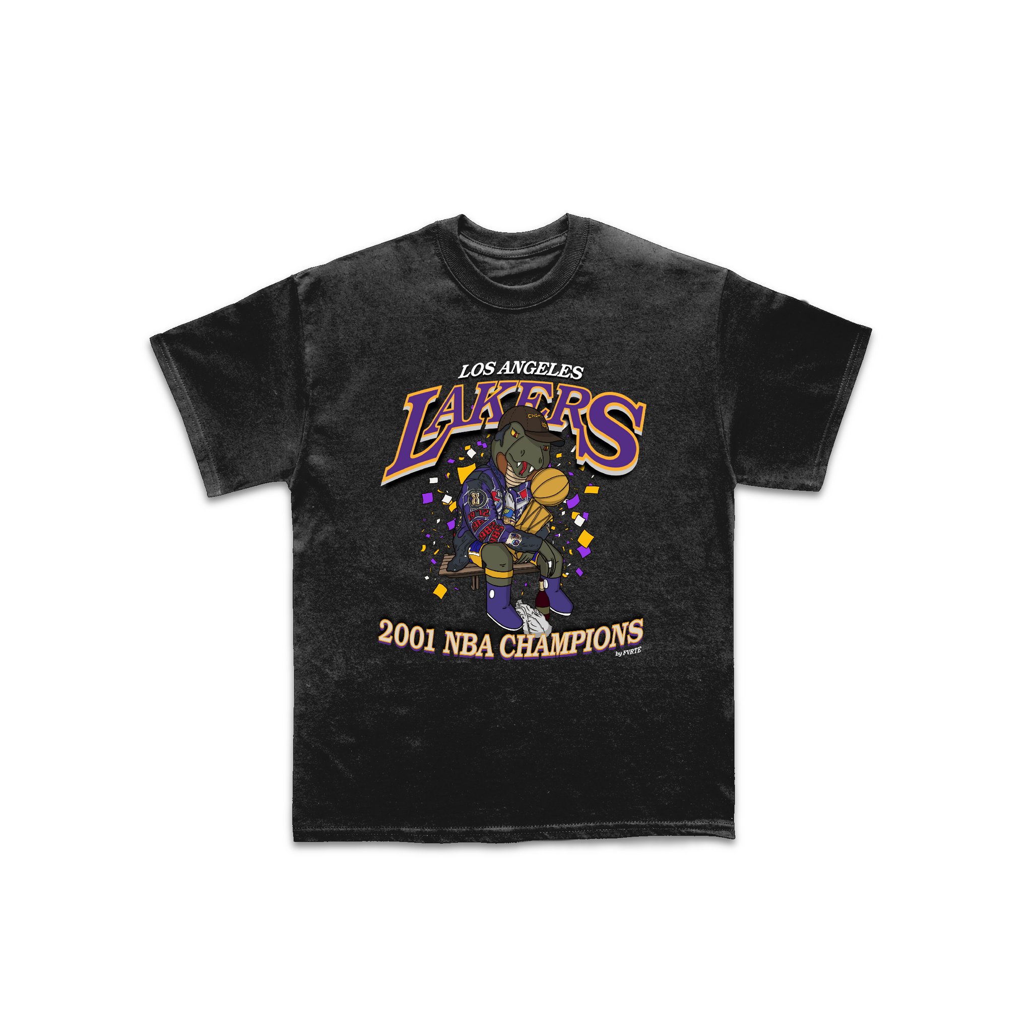 A short-sleeved tee, with a Los Angeles Lakers 2001 Championship Mamba mascot graphic on the front.